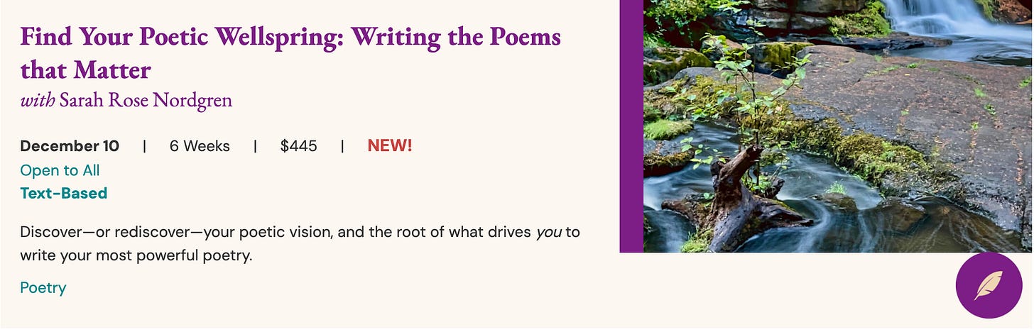 This is a short post to share an upcoming poetry workshop I’ll be teaching this winter. The course is called Find Your Poetic Wellspring: Writing Poems that Matter, and it’s open to all levels of writers. Click the image below to read more about the course or register.